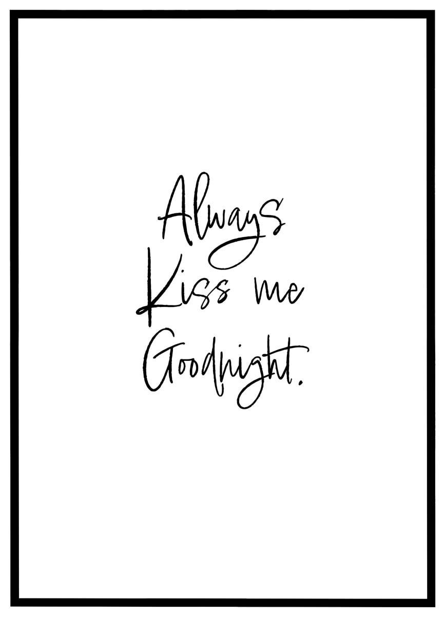 Romantisk plakat med det kærlige budskab "Always kiss me goodnight" i elegant håndskrift, som skaber varme og nærvær i soveværelset eller hjemmets mest intime hjørner.