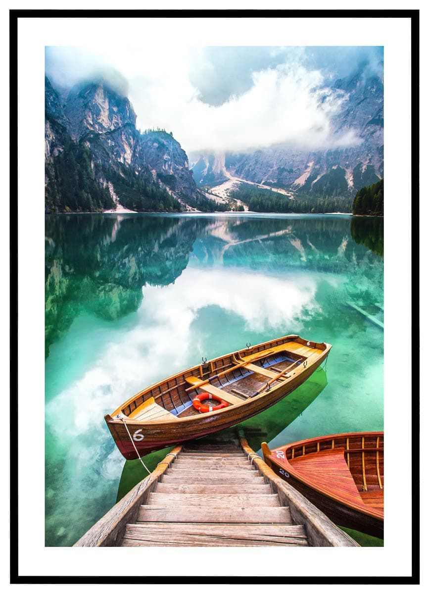 Oplev den idylliske ro ved en bjergsø i Sydtyrol med denne smukke plakat. Motivets klare farver og perfekte spejling i vandet skaber en følelse af balance og harmoni. Den gamle træbåd, der ligger ved en lille bådebro, inviterer til forestillingen om fredfyldte sejlture omgivet af majestætiske bjerge og frodig skov.