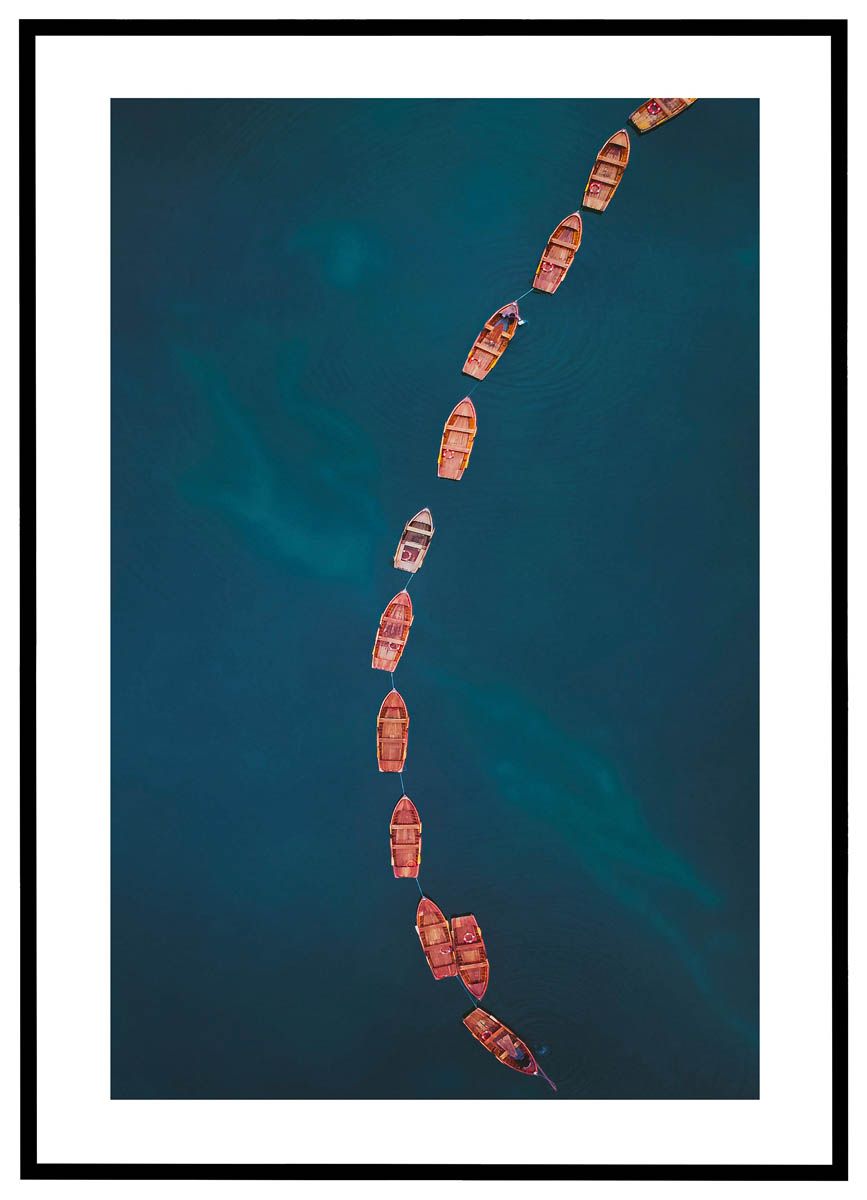 Skab en følelse af ro og balance i dit hjem med denne smukke plakat, der viser en række små træbåde set fra oven. Bådene ligger i en elegant, let buet linje, som strækker sig fra top til bund og skaber et naturligt flow i motivet. Det dybblå vand danner en beroligende baggrund, hvor bådenes varme trætoner fremhæves på subtil vis.