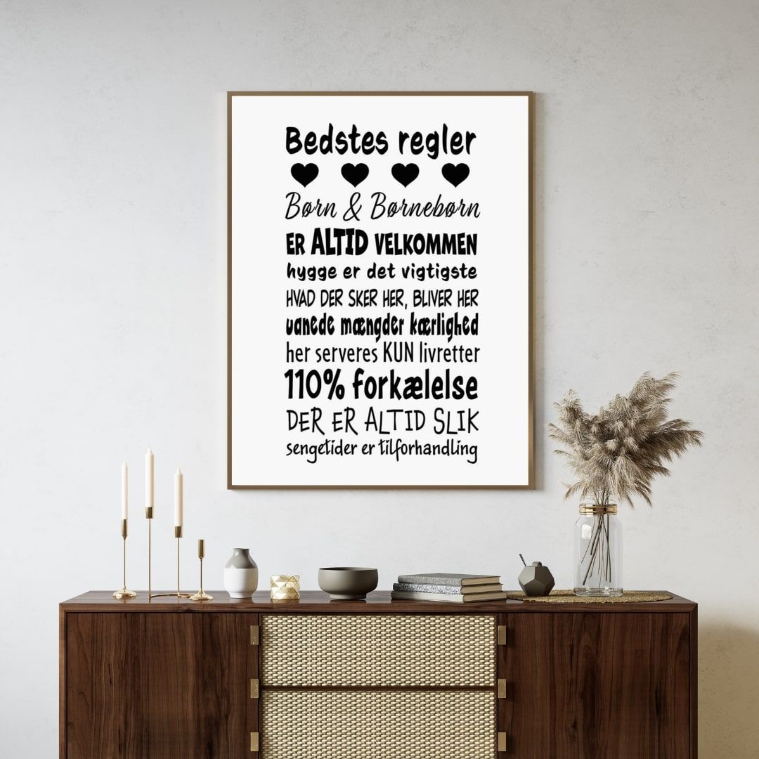 For bedsteforældre, der elsker at skabe et hyggeligt og kærligt fristed for deres børnebørn, er denne plakat den perfekte tilføjelse til hjemmet. "Bedstes regler" beskriver med varme og humor de små, men vigtige traditioner, der gør bedsteforældres hjem til et særligt sted fyldt med kærlighed, forkælelse og hygge.