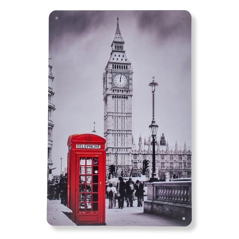 Dette metalskilt præsenterer et ikonisk motiv af Londons berømte vartegn, Big Ben, ledsaget af en klassisk rød telefonboks. Designet fanger essensen af den britiske hovedstad og bringer et strejf af engelsk charme ind i dit hjem. Farverne er levende og detaljerede, hvilket gør skiltet til en iøjnefaldende dekoration for enhver, der elsker London eller ønsker at tilføje et internationalt præg til deres indretning.