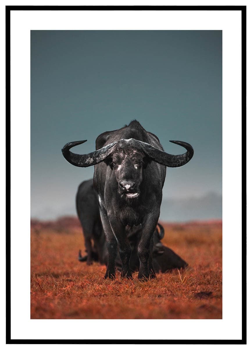 Denne kraftfulde plakat af en bøffel fanger styrken og majestæten hos dette ikoniske dyr. Billedet viser bøflen stående midt på en åben slette, med dens intense blik rettet mod beskueren.