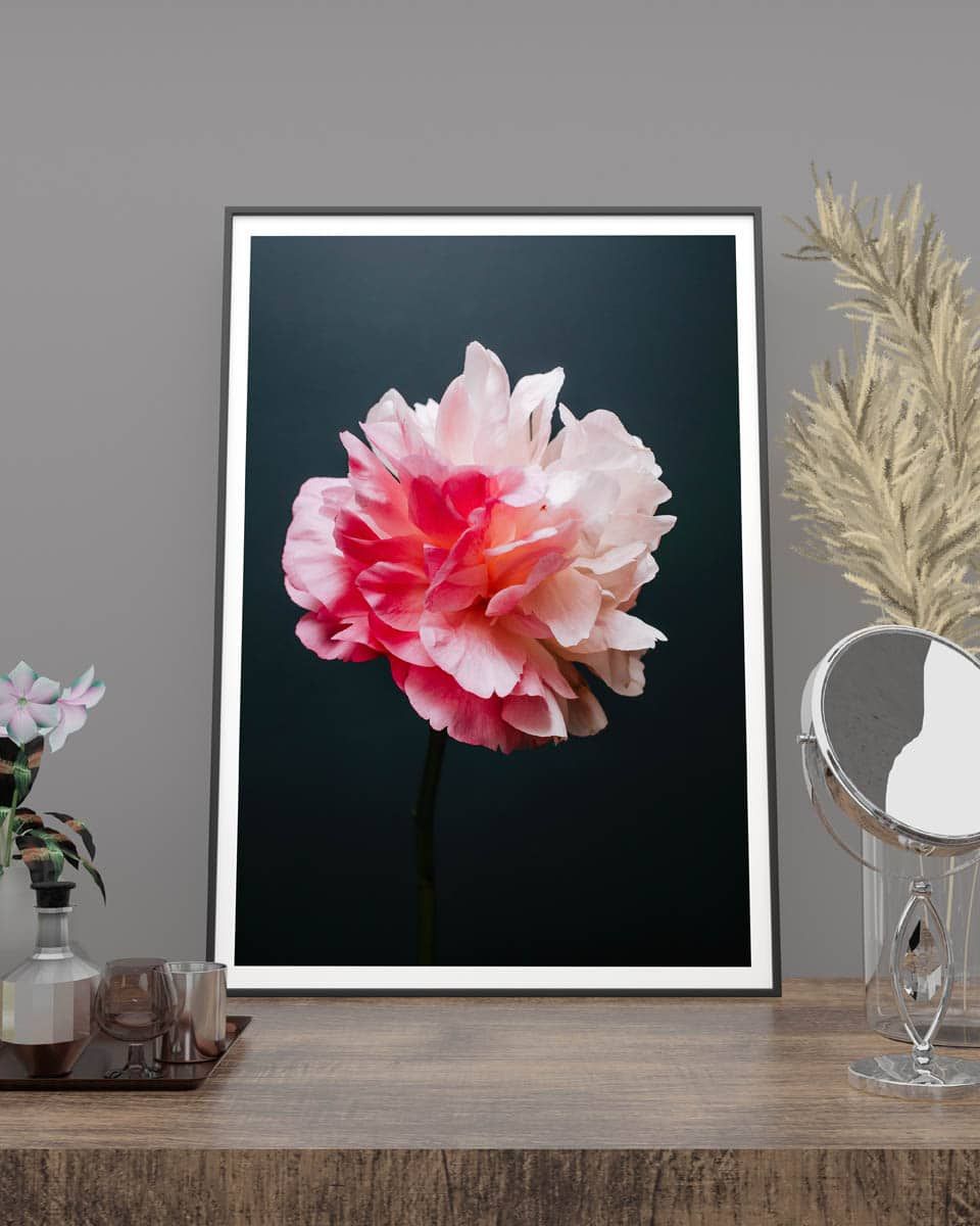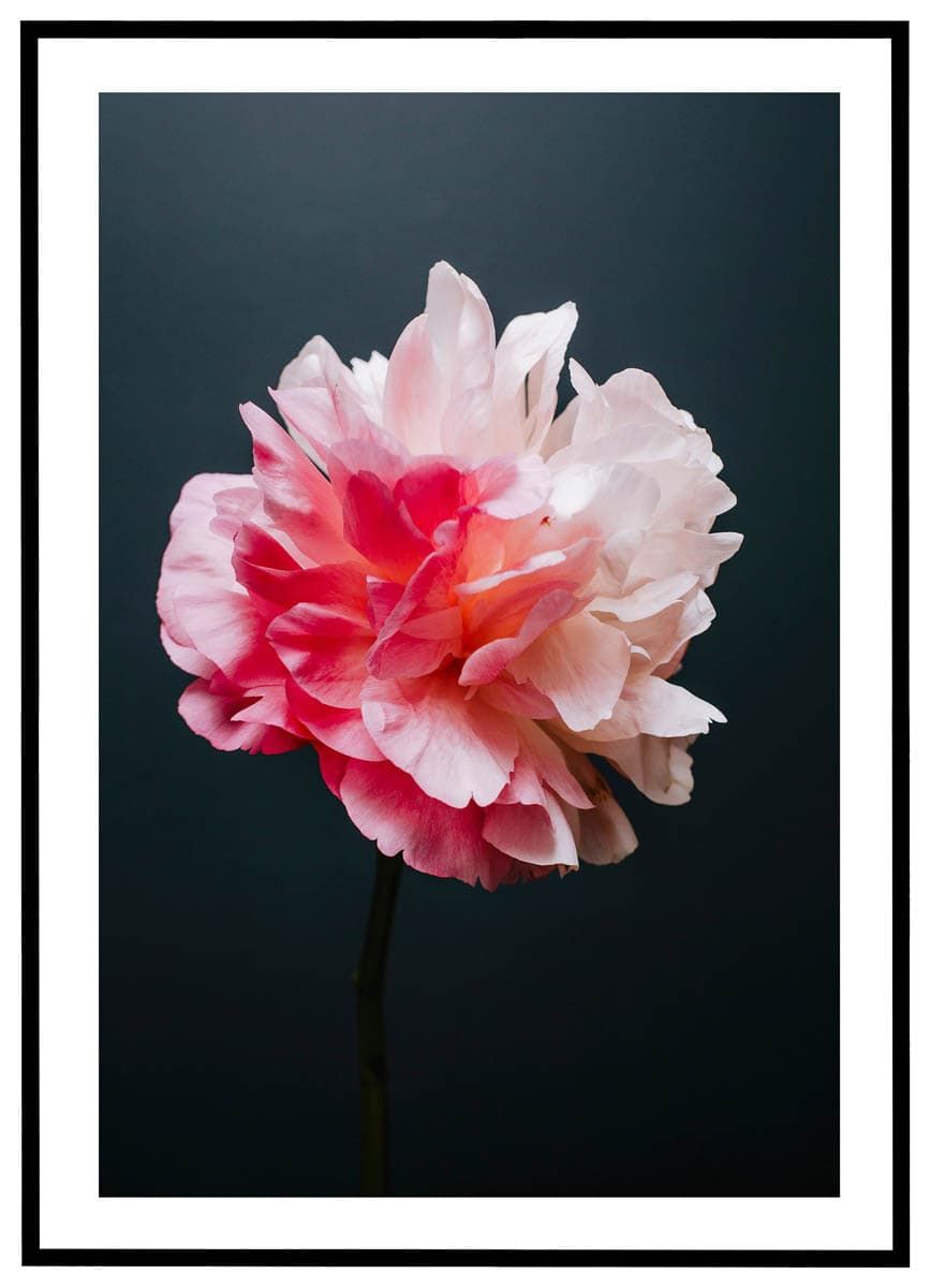 Plakatens kontrast mellem den bløde, lyserøde og hvide farvepalet og den dybe, mørke baggrund giver et dramatisk, næsten malerisk udtryk, som tilfører en følelse af elegance og eksklusivitet. Farverne i blomsten varierer fra intense nuancer af pink til næsten hvide toner, hvilket understreger blomsternes naturlige variation og organiske former. De delikate, bløde blade giver en følelse af lethed og bevægelse, mens den enkle stilk bringer balance til kompositionen.