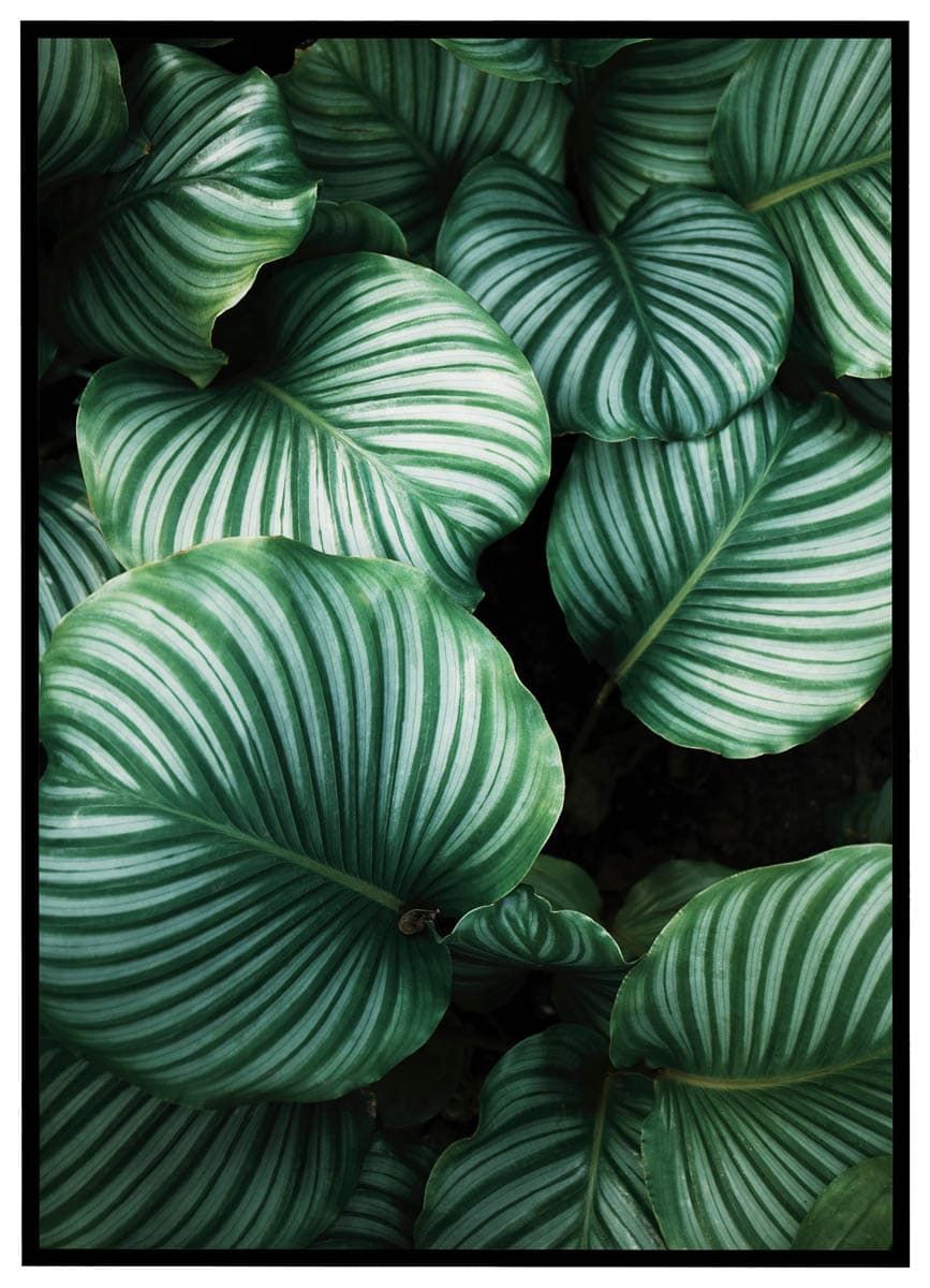 Plakaten tilfører et botanisk og afslappende element til hjemmet, perfekt til stuen, soveværelset eller kontoret. De dybe grønne nuancer kombineret med de lyse striber giver et naturligt, men stilfuldt udtryk, der fungerer godt alene eller i en billedvæg med andre naturmotiver. Den detaljerede gengivelse af bladets struktur gør plakaten både dekorativ og inspirerende.