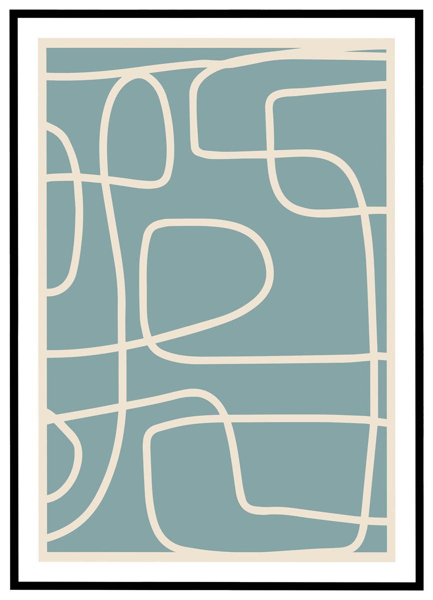 Giv dit hjem et moderne og stilfuldt udtryk med denne minimalistiske kunstplakat, der kombinerer organiske linjer med en rolig, blågrøn baggrund. De bløde, dansende streger skaber en harmonisk balance mellem struktur og frihed, hvilket gør denne plakat til et smukt supplement i ethvert rum.