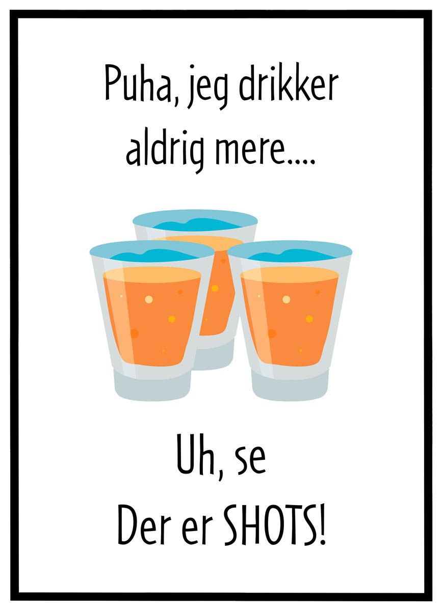 Plakaten viser teksten: ”Puha, jeg drikker aldrig mere… Uh, se, der er SHOTS!” – et citat der med et glimt i øjet spiller på de klassiske tømmermandsløfter, som hurtigt smuldrer ved synet af næste runde.