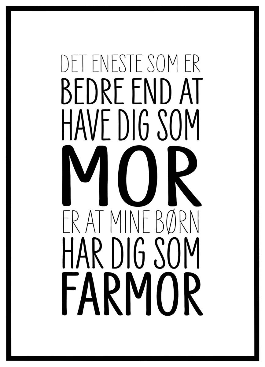 Plakaten her er en kærlig og personlig hyldest til den kvinde, der både er en fantastisk mor og en elsket farmor. Med teksten: "Det eneste som er bedre end at have dig som mor er at mine børn har dig som farmor" udtrykker den en smuk og varm taknemmelighed, der går lige i hjertet. Den er oplagt som gave til Mors Dag, fødselsdag eller bare som en overraskelse, der viser, hvor meget hun betyder.