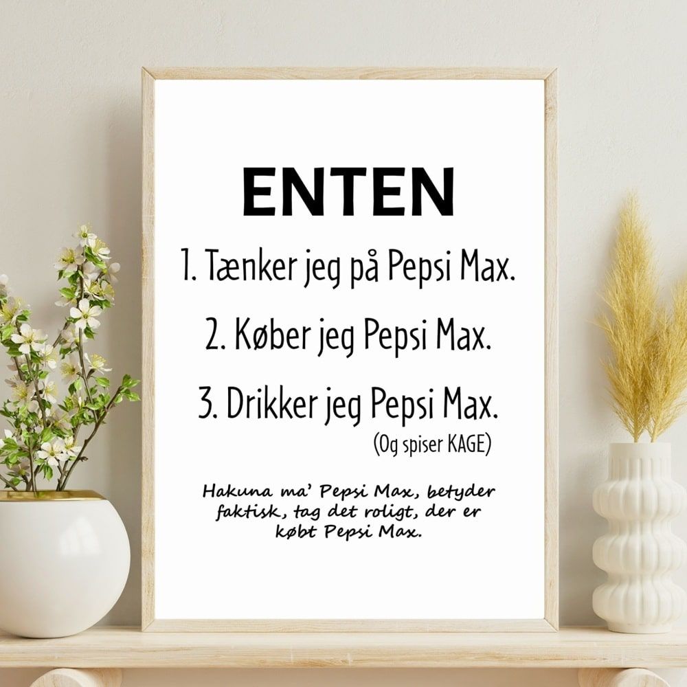 Plakaten med det humoristiske citat om Pepsi Max er en hyldest til alle dem, der ikke bare nyder en sodavand – men lever for den. Med teksten: “Enten tænker jeg på Pepsi Max, køber jeg Pepsi Max eller drikker jeg Pepsi Max (og spiser kage)” rammer plakaten plet i den selvironiske og charmerende tone, som mange fans af den populære drik vil kunne genkende sig selv i. Afslutningen med en sjov fortolkning af “Hakuna ma’ Pepsi Max” giver det hele et ekstra humoristisk twist og tilføjer personlighed til ethvert rum.