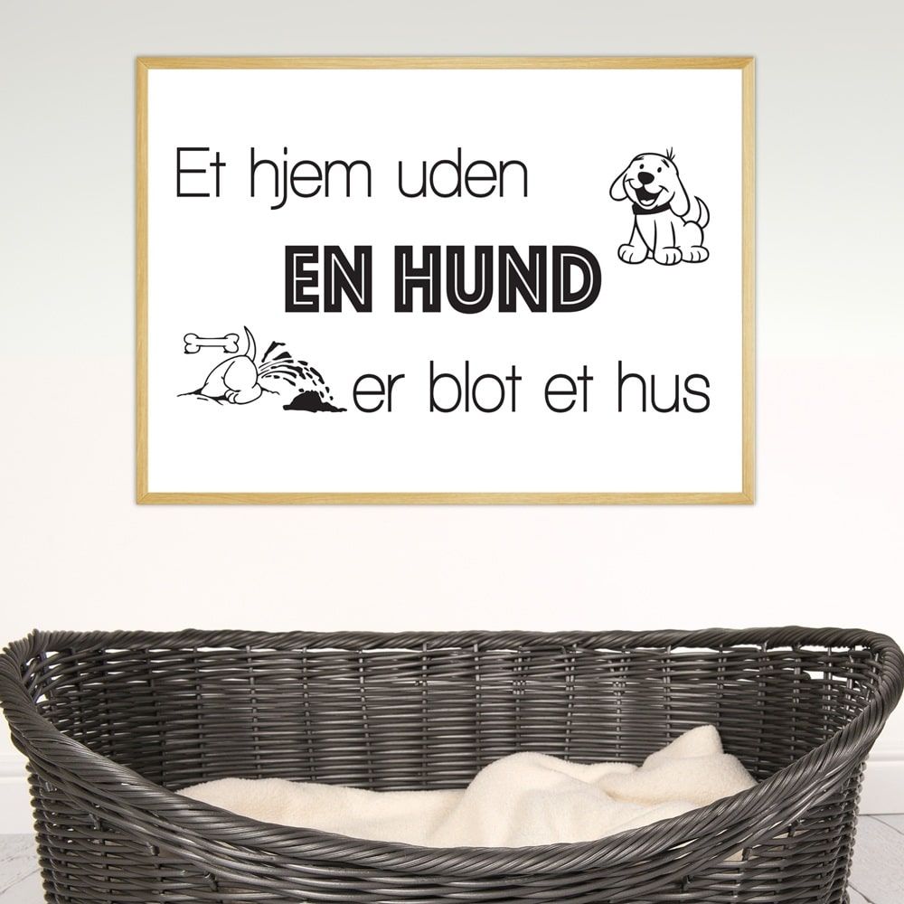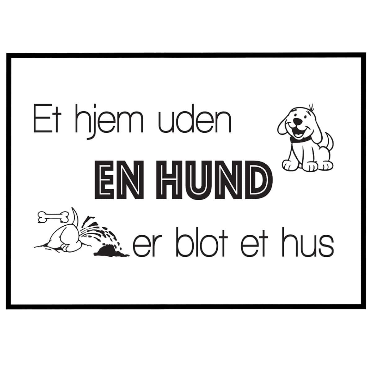Plakaten har et enkelt og stilrent design, hvor teksten kombineres med små grafiske elementer – herunder en glad hund, et ben og en hund der graver – som tilfører et humoristisk og charmerende touch. Den tydelige typografi, hvor "EN HUND" er fremhævet i fed og sort skrift, sikrer, at budskabet ikke går ubemærket hen. Det minimalistiske udtryk gør plakaten nem at indpasse i enhver boligindretning, hvad enten det er i entreen, køkkenet, stuen eller ved hundens eget hvilested.