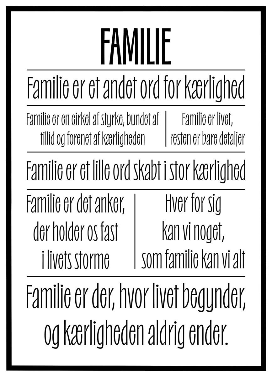 FAMILIE – Familie er et andet ord for kærlighed. Familie er en cirkel af styrke, bundet af tillid og forenet af kærligheden | Familie er livet, resten er bare detaljer. Familie er et lille ord skabt i stor kærlighed. Familie er det anker, der holder os fast i livets storme | Hver for sig kan vi noget, som familie kan vi alt. Familie er der, hvor livet begynder, og kærligheden aldrig ender.