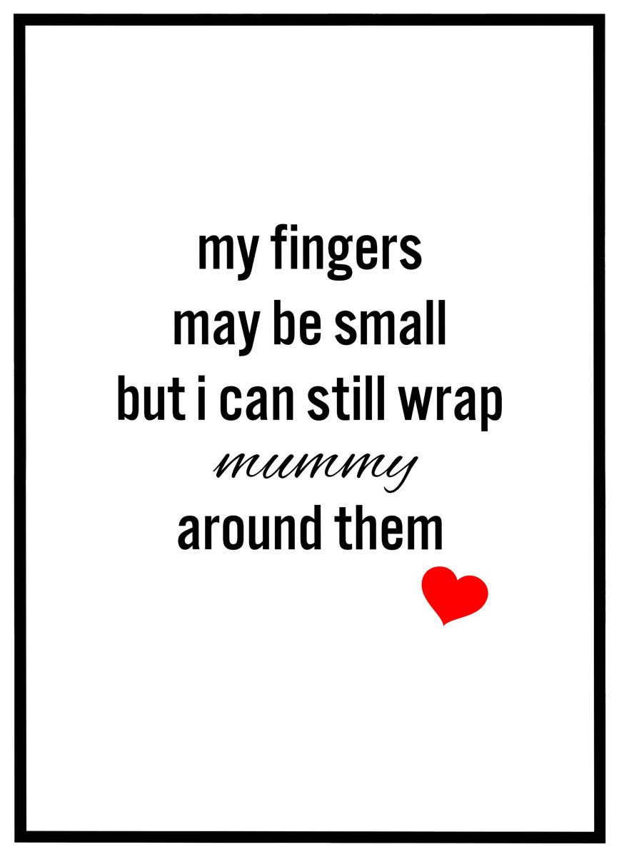 Plakaten med teksten “My fingers may be small but I can still wrap mummy around them” er en kærlig og hjertevarm hyldest til båndet mellem mor og barn. Den søde formulering fremkalder et smil og rører hjertet – både hos moderen, der læser den, og hos dem, der kender til den ubetingede kærlighed i forældreskabet. Typografien er enkel og letlæselig, hvor ordet “mummy” fremhæves med en kursiv skrift for at understrege det følelsesmæssige fokus, og et lille rødt hjerte i nederste hjørne sætter et kærligt punktum for budskabet.