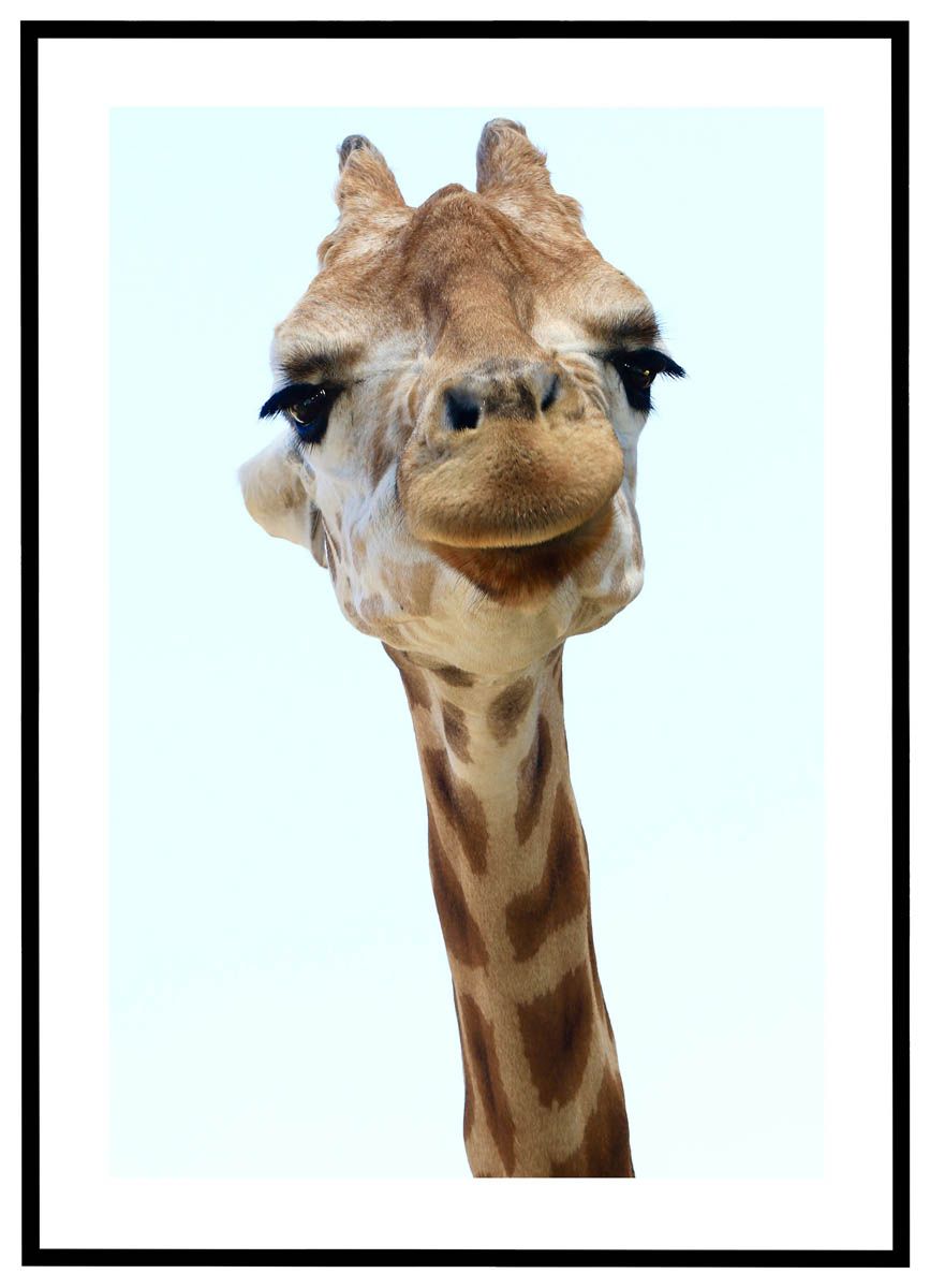 Bring et strejf af humor og elegance ind i dit hjem med denne charmerende plakat af en giraf i nærbillede. Giraffens nysgerrige og udtryksfulde ansigt er fanget med stor detalje, hvilket gør dette kunstværk til et iøjnefaldende og unikt indslag i din indretning.