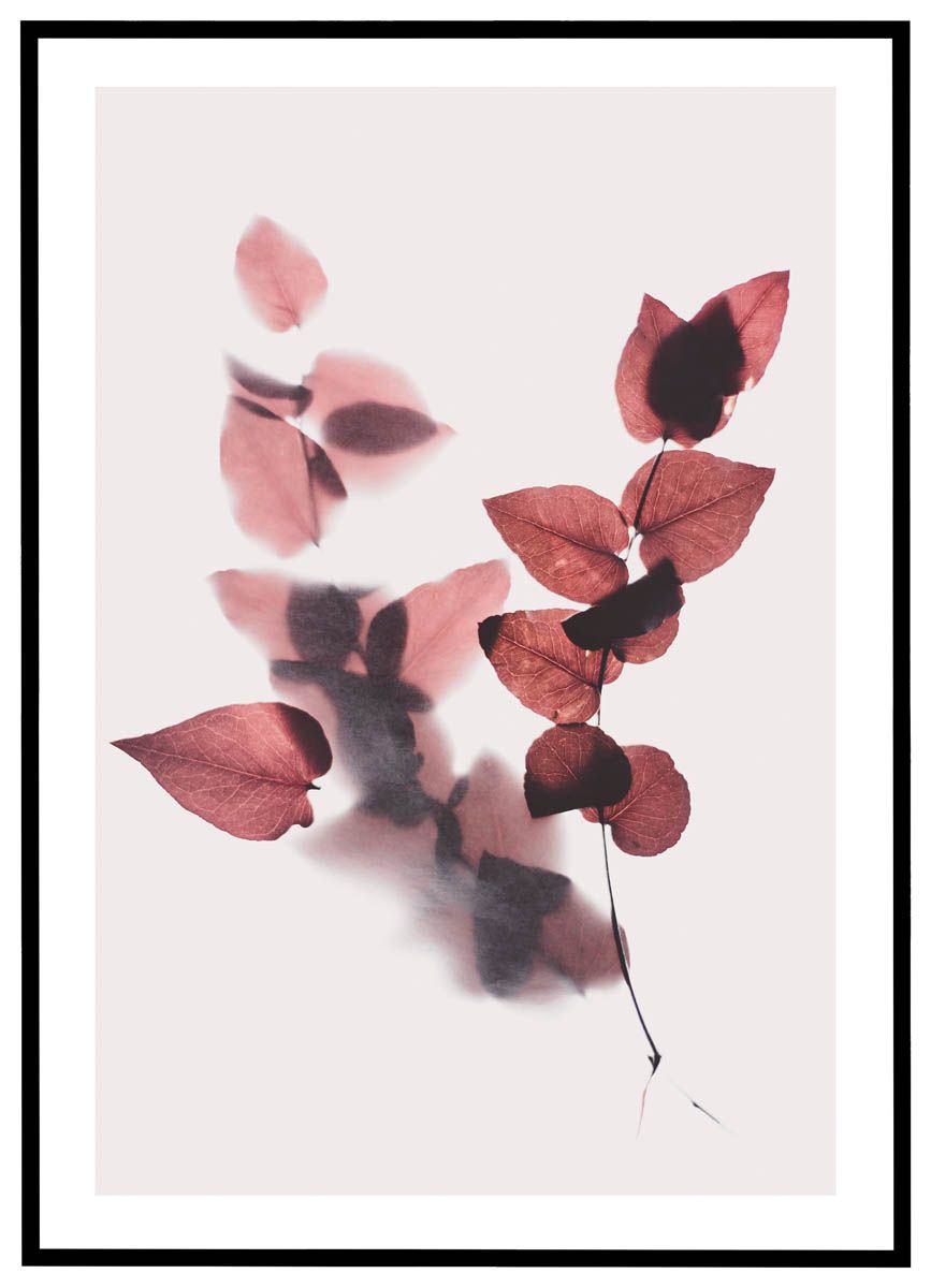 Denne elegante plakat præsenterer en kunstnerisk fortolkning af røde blade, der kaster bløde skygger på en lys baggrund. Motivet skaber en smuk balance mellem det naturlige og det abstrakte, hvor bladenes organiske former smelter sammen med de diffuse skygger, hvilket tilfører en næsten drømmende effekt. Den varme, rødlige farvetone tilfører dybde og elegance, mens den enkle komposition gør motivet tidløst og moderne.
