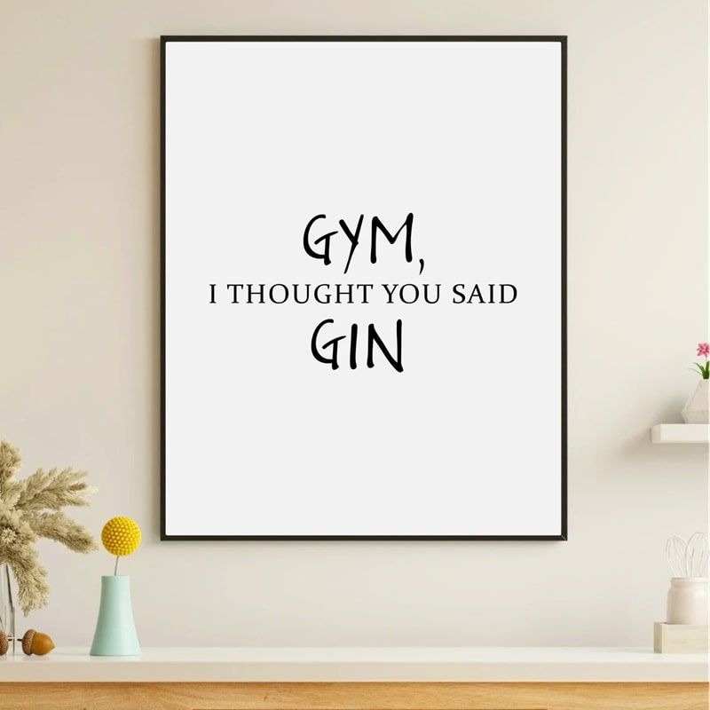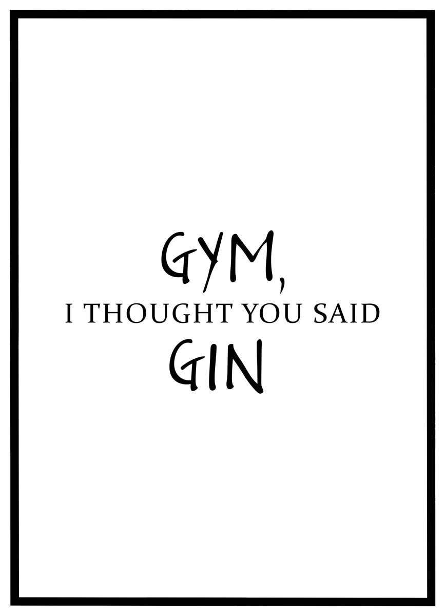 Plakaten bærer teksten “Gym, I thought you said gin”, et ordspil der elegant spiller på ligheden mellem “gym” og “gin” – og leverer et smil til både fitnessentusiaster og livsnydere.