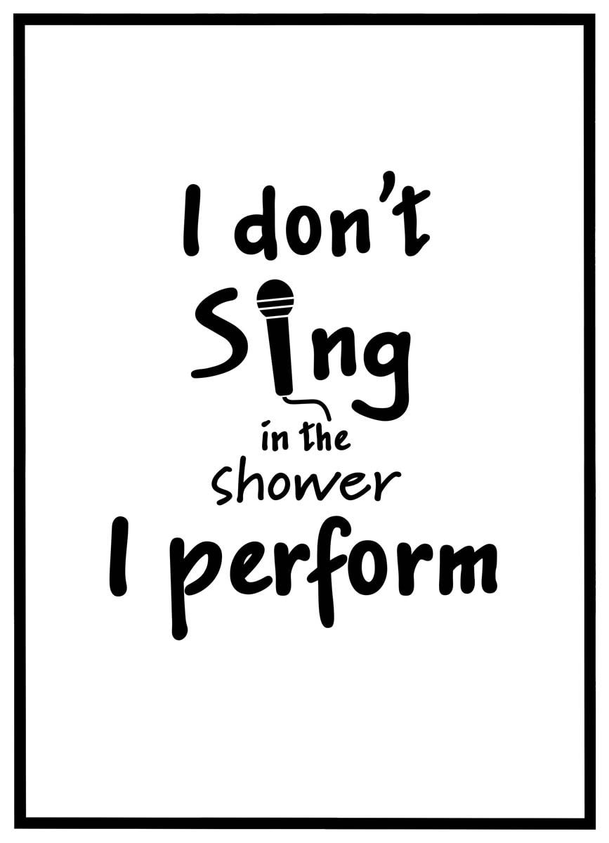 Plakaten med teksten “I don’t sing in the shower – I perform” er en hyldest til den indre stjerne i os alle. Den fanger med humor og charme den følelse, mange kender: når brusebadet forvandles til en koncertscene, og shampooen bliver til mikrofon. Denne plakat emmer af selvironi og musikalitet, og er det perfekte statement til dig, der tager dit badekarriere seriøst – med et glimt i øjet.
