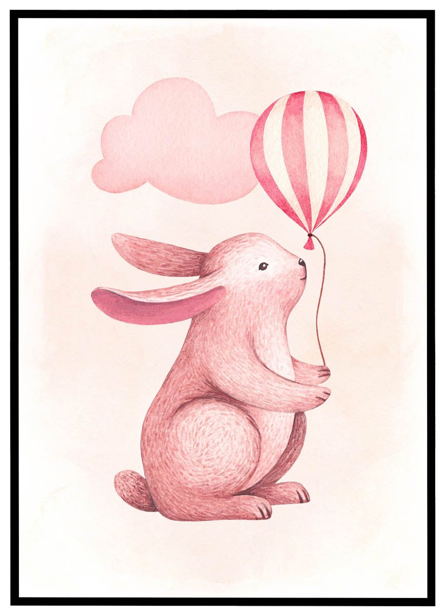 Med sin varme rosa farveskala og blide udtryk bringer denne plakat et strejf af eventyr og sødme ind på børneværelset – motivet viser en nuttet kanin, der holder en rød- og hvidstribet ballon i hånden, som svæver mod en rosa sky i baggrunden. Det håndmalede akvarel-look giver plakaten et roligt, drømmende udtryk og gør den oplagt som en del af en hyggelig og tryg atmosfære for både små piger og drenge.