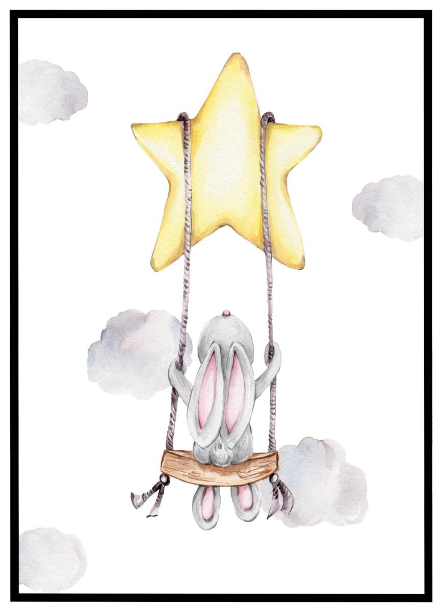 Denne charmerende plakat viser en nuttet lille kanin, der gynger fredeligt fra en stor gylden stjerne i himlen omgivet af lette, drømmende skyer – et motiv der emmer af fantasi, ro og tryghed. Med sine bløde, afdæmpede akvarelfarver og fine detaljer er plakaten ideel til at skabe en hyggelig og drømmende stemning på børneværelset.