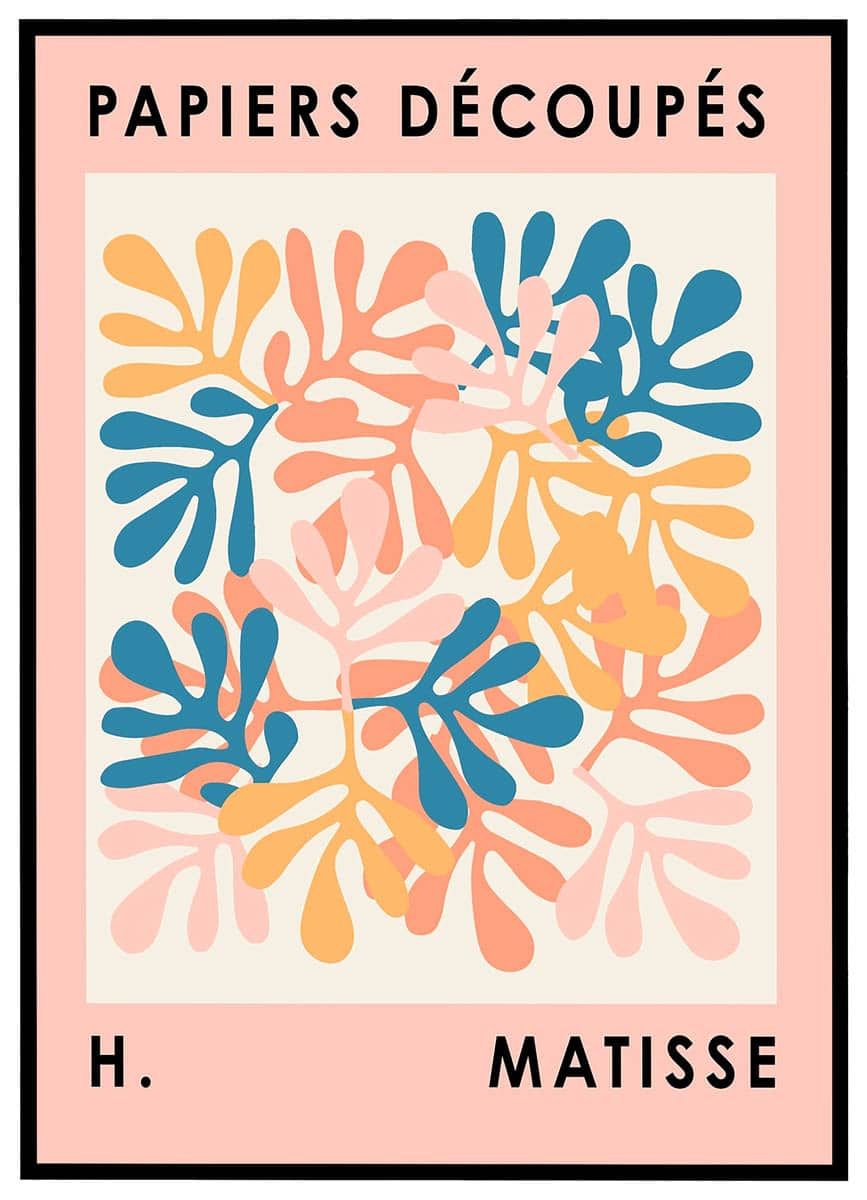 Med denne farverige og grafisk dragende plakat bringes Henri Matisses legendariske papirklipkunst ind i et moderne og stilrent hjem. Plakaten er inspireret af hans sene kunstneriske periode, hvor han arbejdede med såkaldte "papiers découpés" – udklip i papir, der blev sat sammen til fantasifulde, organiske mønstre. Dette motiv er en harmonisk komposition af bladlignende former i støvede nuancer af rosa, fersken, gul og dyb blå, som tilsammen danner et dynamisk og levende billede. Den lyse baggrund og de afstemte pastelfarver gør motivet let og luftigt, og den pink kant med teksten “Papiers Découpés” og “H. Matisse” fuldender det kunstneriske udtryk med stil.