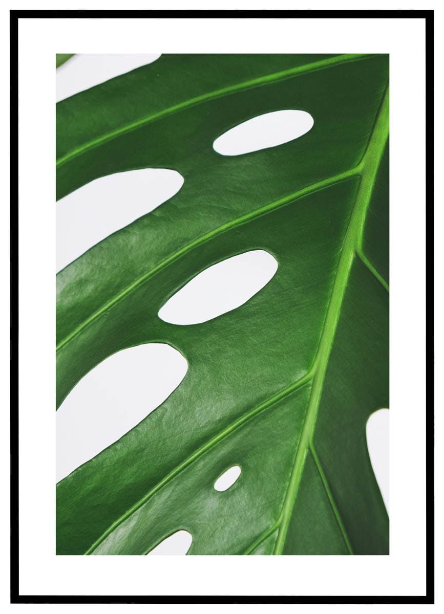 Bring naturens elegance ind i dit hjem med denne smukke plakat, der viser et nærbillede af et monstera-blad. Det detaljerede motiv fremhæver de karakteristiske åbninger og den dybe, grønne farve, der kendetegner denne populære plante. Det er en visuel hyldest til naturens perfektion og skønhed, og dens enkle design gør den nem at integrere i enhver indretning.