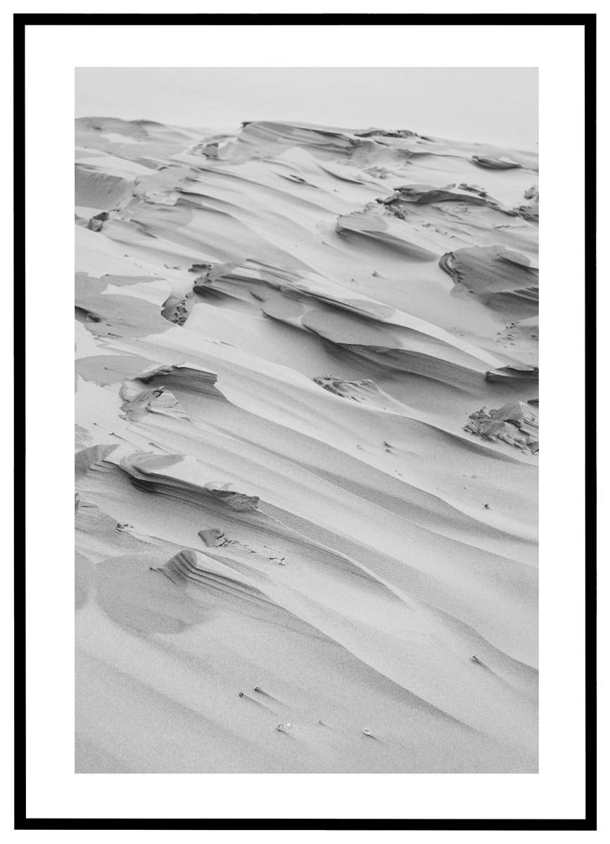 Denne stemningsfulde plakat i sort-hvid gengiver et stykke af ørkenens æstetik med poetisk præcision. Billedet viser en bølgende sandflade, hvor vindens bevægelser har skabt skarpe mønstre og bløde konturer. Det minimalistiske udtryk og den fraværende horisont trækker blikket ind i motivets struktur og skaber en næsten meditativ følelse – som om man står midt i stilheden og mærker roen brede sig.