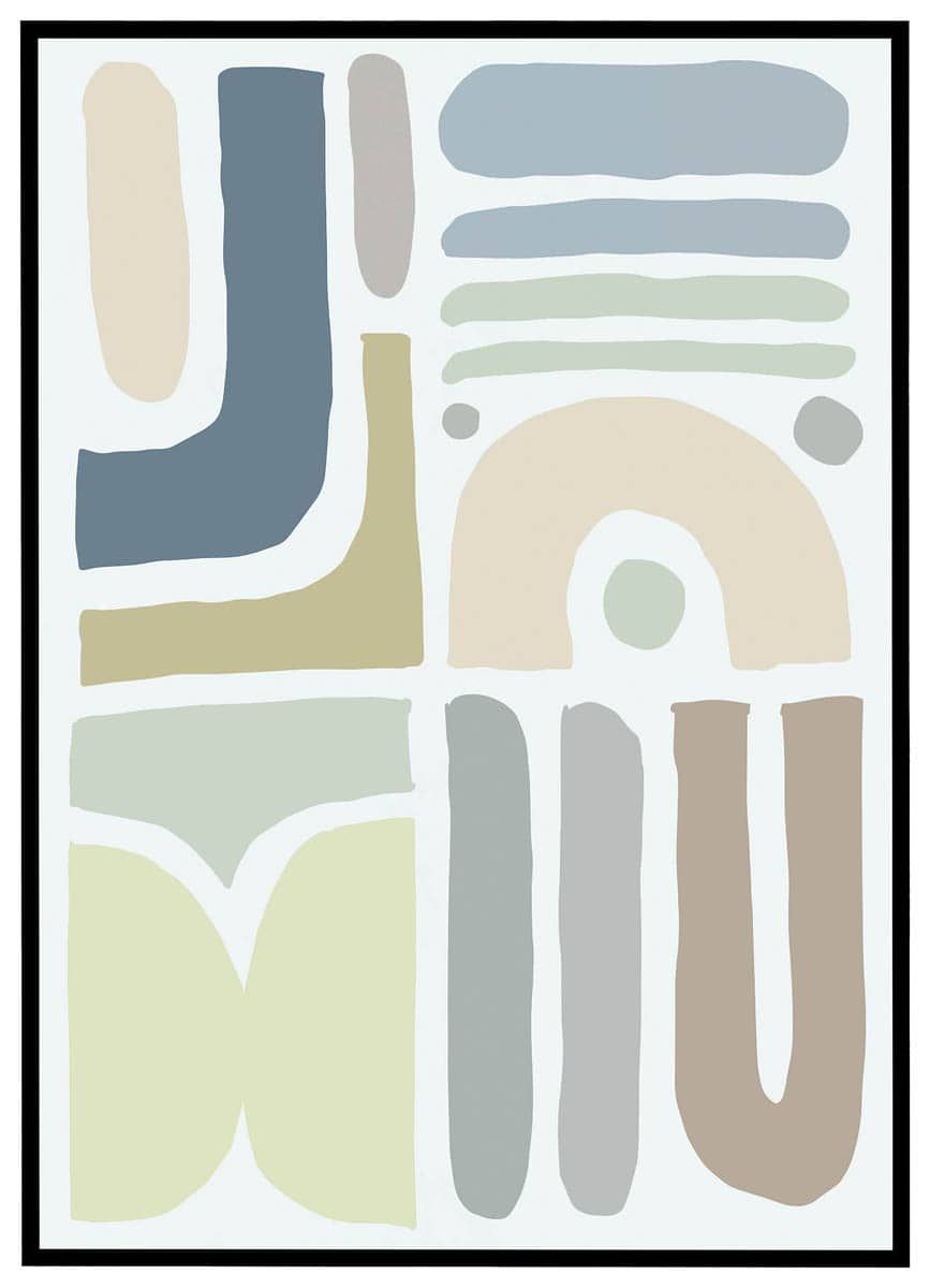 Denne plakat er en rolig og balanceret hyldest til det organiske formsprog. Her samles bløde, håndtegnede former i afdæmpede farvetoner af støvet blå, salviegrøn, sand og gråbeige. Farverne komplementerer hinanden på en måde, der skaber en harmonisk helhed, og plakatens strukturer fremstår både grafiske og naturlige – som aftryk fra sten, blade eller landskaber set fra oven. Det skaber en sanselig og æstetisk oplevelse, der inviterer til fordybelse og visuel ro.