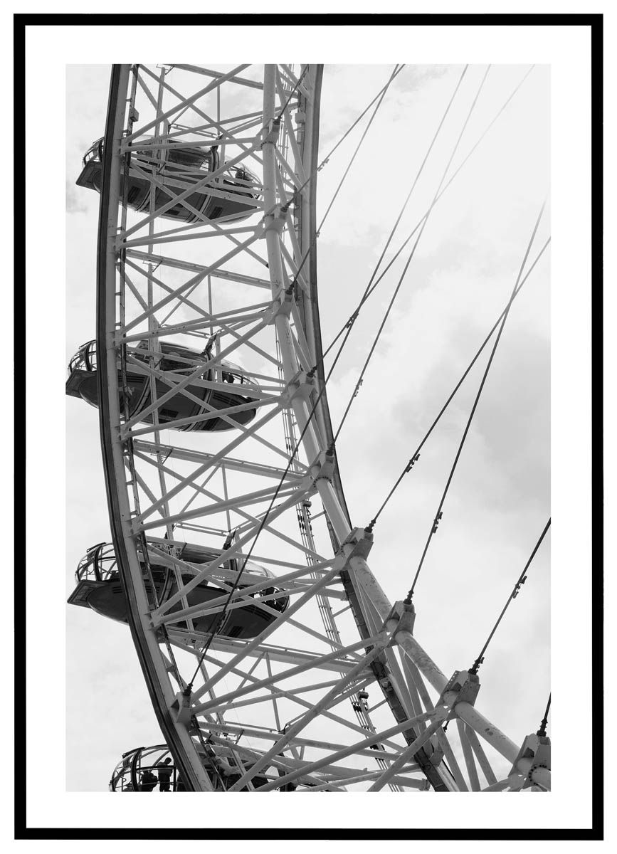 Tilføj et strejf af moderne storbyæstetik til din indretning med denne elegante sort-hvide plakat af et pariserhjul set i close-up. Det grafiske udtryk fremhæver de geometriske linjer og den industrielle struktur i hjulets metalkonstruktion, hvilket skaber en spændende kontrast til den bløde, let disede himmel i baggrunden. Billedet fanger både bevægelse og ro, og fremstår som et kunstnerisk øjebliksbillede af byens puls og menneskets fascination af højde og udsyn.