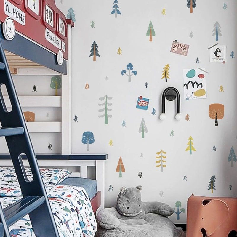 Skab en eventyrlig og hyggelig atmosfære på børneværelset med denne charmerende wallsticker, der består af hele 48 små træer i forskellige størrelser og farver. Designet er inspireret af en fantasifuld skov fyldt med sjove og stiliserede træer, der bringer naturens magi ind i hjemmet på en legende og kreativ måde.