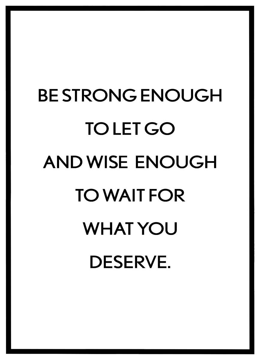 Plakaten "Be strong enough to let go" kombinerer inspirerende livsvisdom med stilren æstetik og er skabt til dem, der ønsker daglig påmindelse om styrke, tålmodighed og selvrespekt. Den minimalistiske sort-hvide opsætning gør budskabet endnu stærkere, mens skrifttypens rene linjer sikrer, at teksten fremstår tydelig og elegant på væggen.