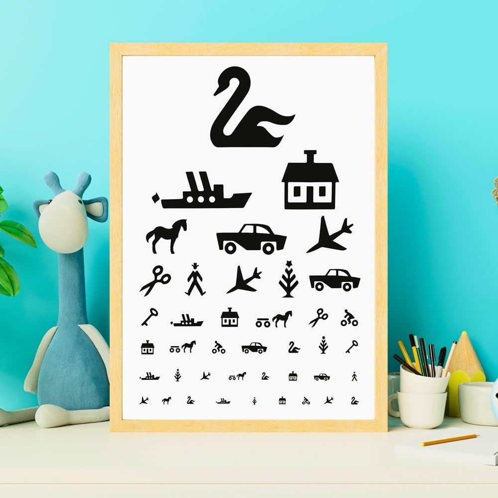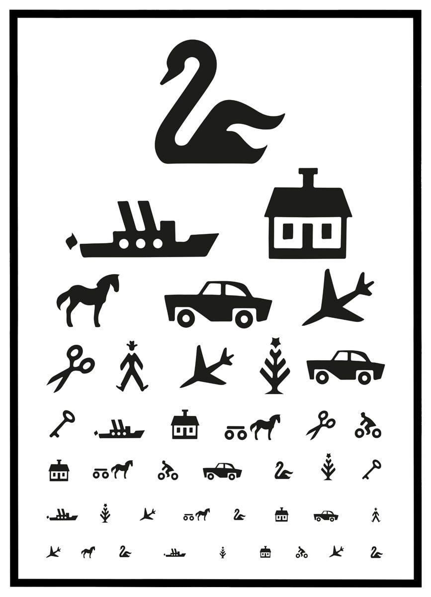 Denne finurlige og dekorative plakat er en charmerende fortolkning af den klassiske synstavle – designet med et børnevenligt twist. I stedet for bogstaver prydes plakaten af velkendte silhuetter såsom en svane, hus, bil, saks, cykel og skib, arrangeret i faldende størrelser fra top til bund. Det grafiske udtryk er holdt i enkle, sorte figurer på hvid baggrund, hvilket skaber et moderne og stilrent look, der passer ind i både børneværelset, legehjørnet og kreative rum.