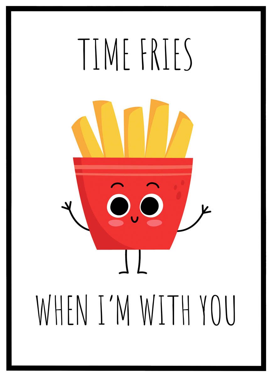 Plakaten "Time fries when I'm with you" er en charmerende og humoristisk vægdekoration, der leger med sproget på den sødeste måde. Det lille, smilende kræmmerhus med fritter emmer af glæde og venlighed og gør plakaten ideel til køkkener, caféområder eller børneværelser. Dens enkle design og varme farver gør den til en perfekt gave til én, du gerne vil vise din kærlighed på en let og sjov måde.