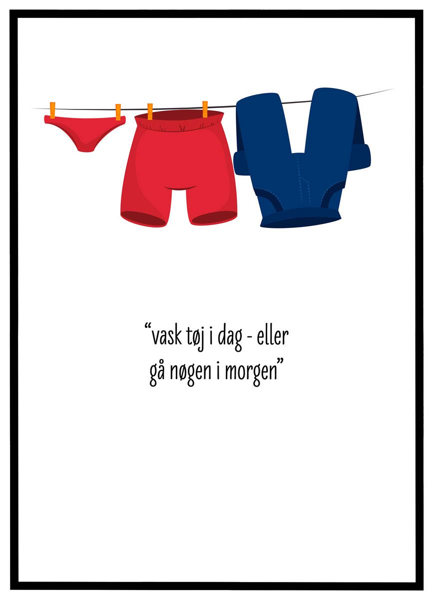 En sjov og charmerende plakat, perfekt til vaskerummet eller badeværelset. Den humoristiske tekst "Vask tøj i dag – eller gå nøgen i morgen" sætter et smil på læben, samtidig med at den fungerer som en venlig påmindelse om at holde vasketøjet opdateret.