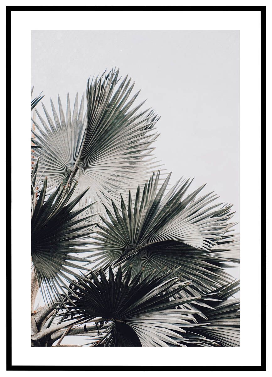 Denne plakat indfanger den enestående skønhed og grafiske elegance i viftepalmen – en plante, der med sine karakteristiske, solfjerformede blade skaber et næsten arkitektonisk udtryk. De stramt radiale linjer i bladene spreder sig som en stjerne mod himlen og giver et indtryk af både styrke og finesse. Den lyse, afdæmpede baggrund får de grønne toner til at fremstå med særlig klarhed, og det næsten monokrome farvevalg bidrager til et moderne, minimalistisk æstetisk udtryk.