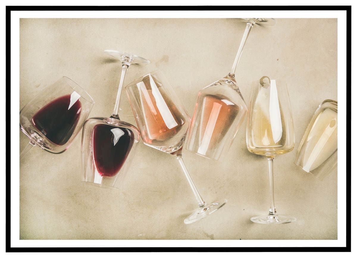 En elegant og stilfuld plakat, der hylder skønheden og mangfoldigheden i vinens verden. Billedet præsenterer en samling af vinglas, fyldt med forskellige nuancer af vin - fra dyb rød til sprød hvid og sart rosé. Den varme baggrund skaber en rolig og sofistikeret stemning, der passer perfekt til både køkkenet, vinkælderen eller spisestuen.